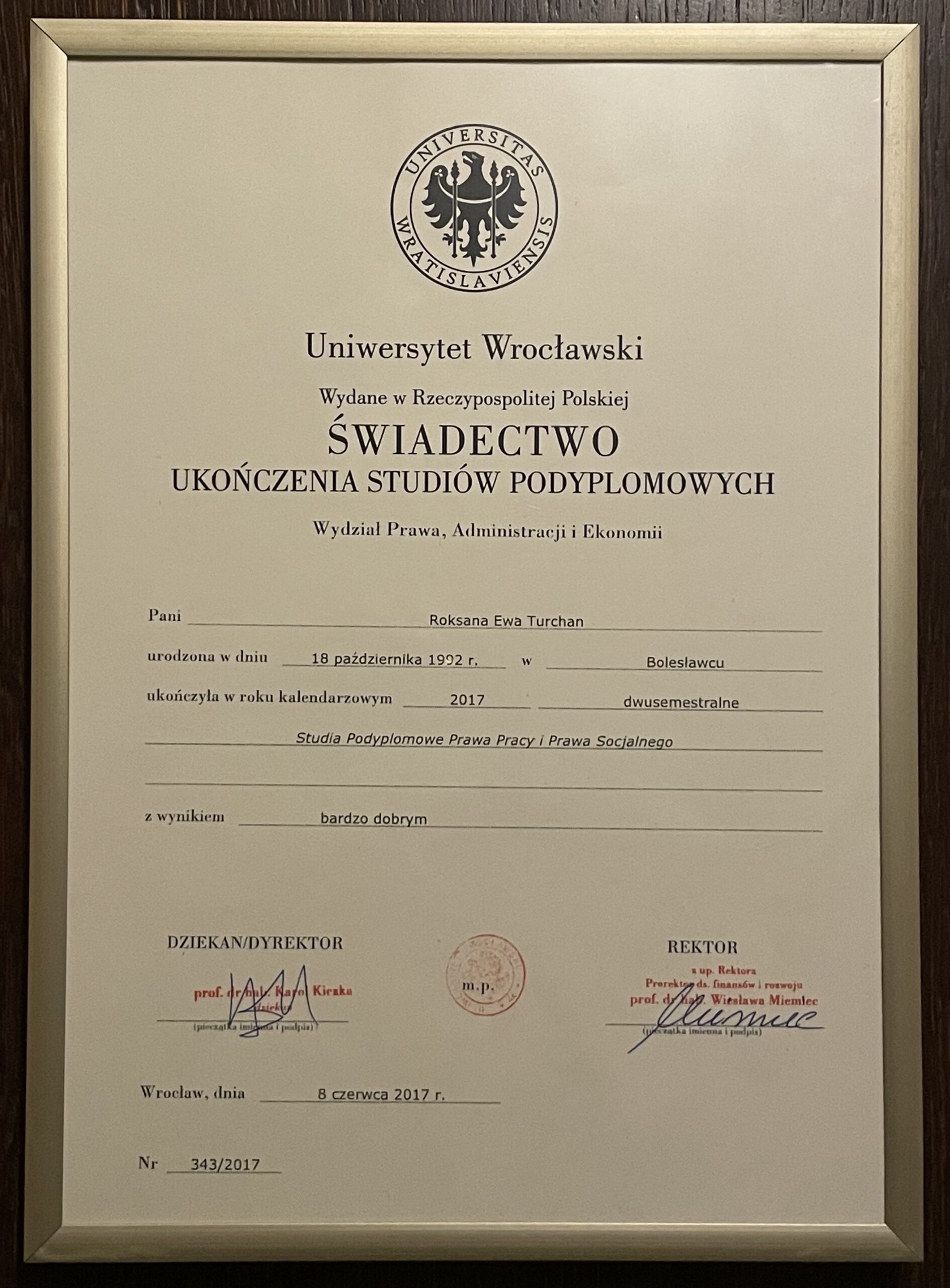 Adwokat Roksana Turchan ukończyła studia prawnicze na Wydziale Prawa, Administracji i Ekonomii Uniwersytetu Wrocławskiego, a także studia podyplomowe z zakresu prawa pracy i prawa socjalnego. Od 2018 roku prowadzi zajęcia z prawa pracy i prawa zabezpieczenia społecznego na Uniwersytecie Wrocławskim