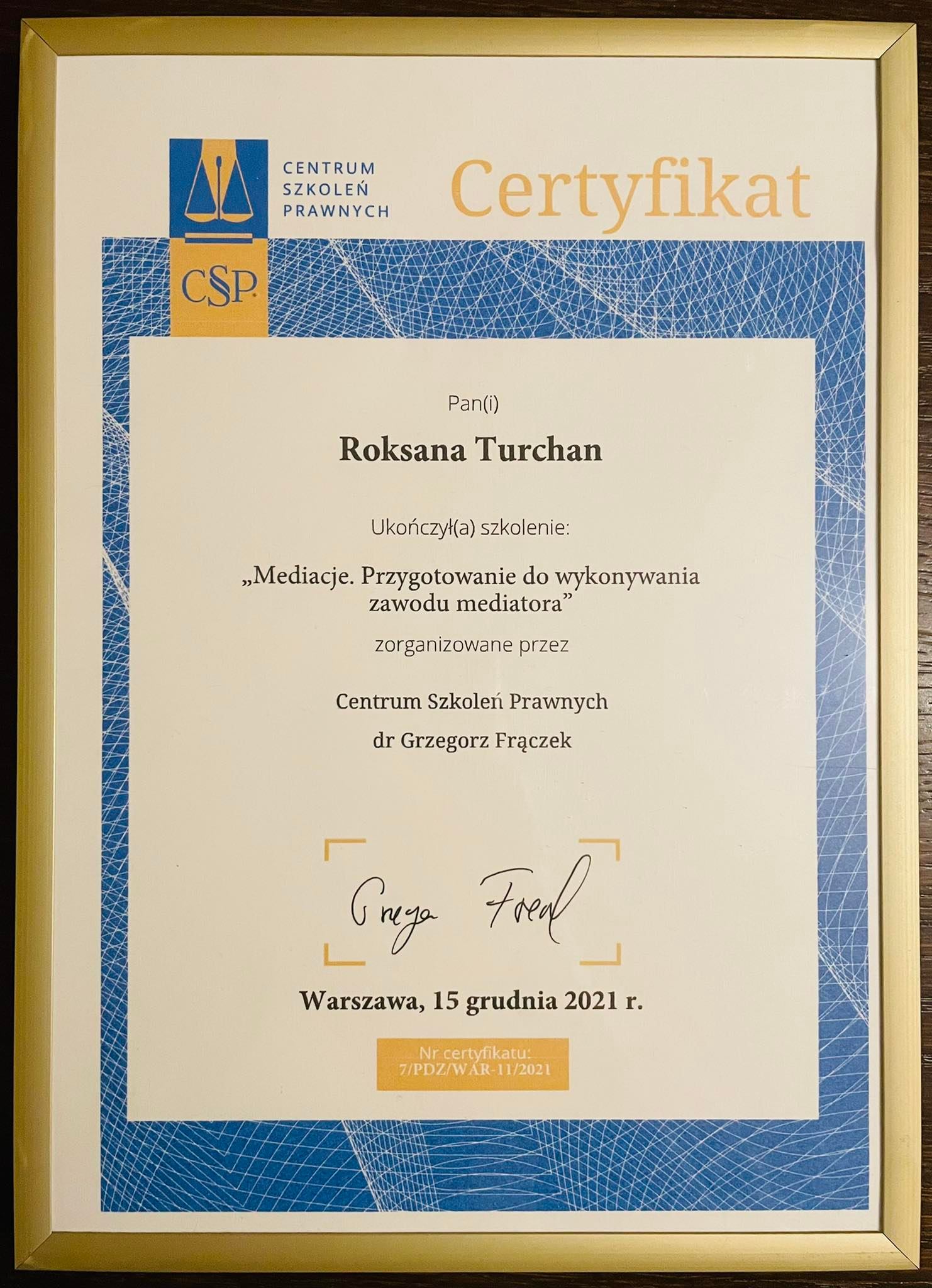 Adwokat Roksana Turchan ukończyła szkolenie w Centrum Szkoleń Prawnych dr Grzegorz Frączek uprawniające do wykonywania zawodu mediatora, a następnie została wpisana na:
